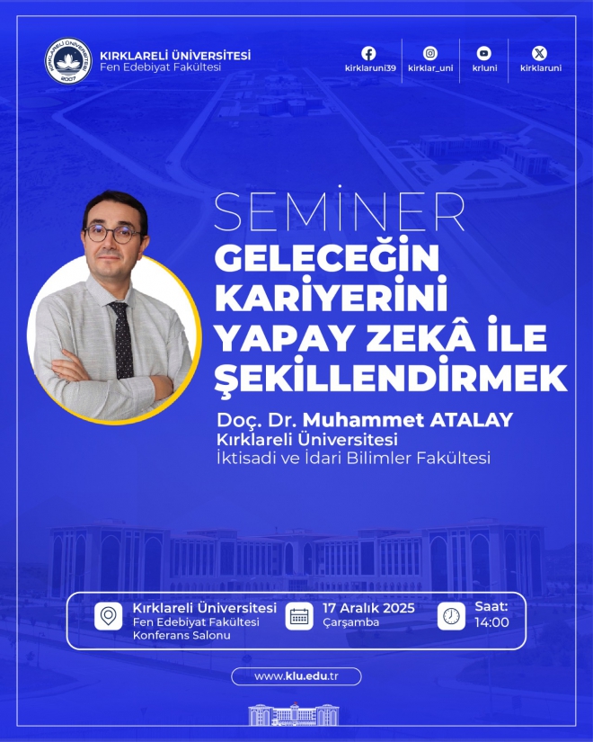Bölümümüz tarafından düzenlenen, İktisadi ve İdari Bilimler Fakültesi’nden Doç. Dr. Muhammet Atalay’ın konuşmacı olarak yer alacağı, “Geleceğin Kariyerini Yapay Zeka İle Şekillendirmek” konu başlıklı seminer, 17 Aralık 2025 Çarşamba günü saat 14:00’te, Fakültemiz Konferans Salonu'nda gerçekleştirilecektir.